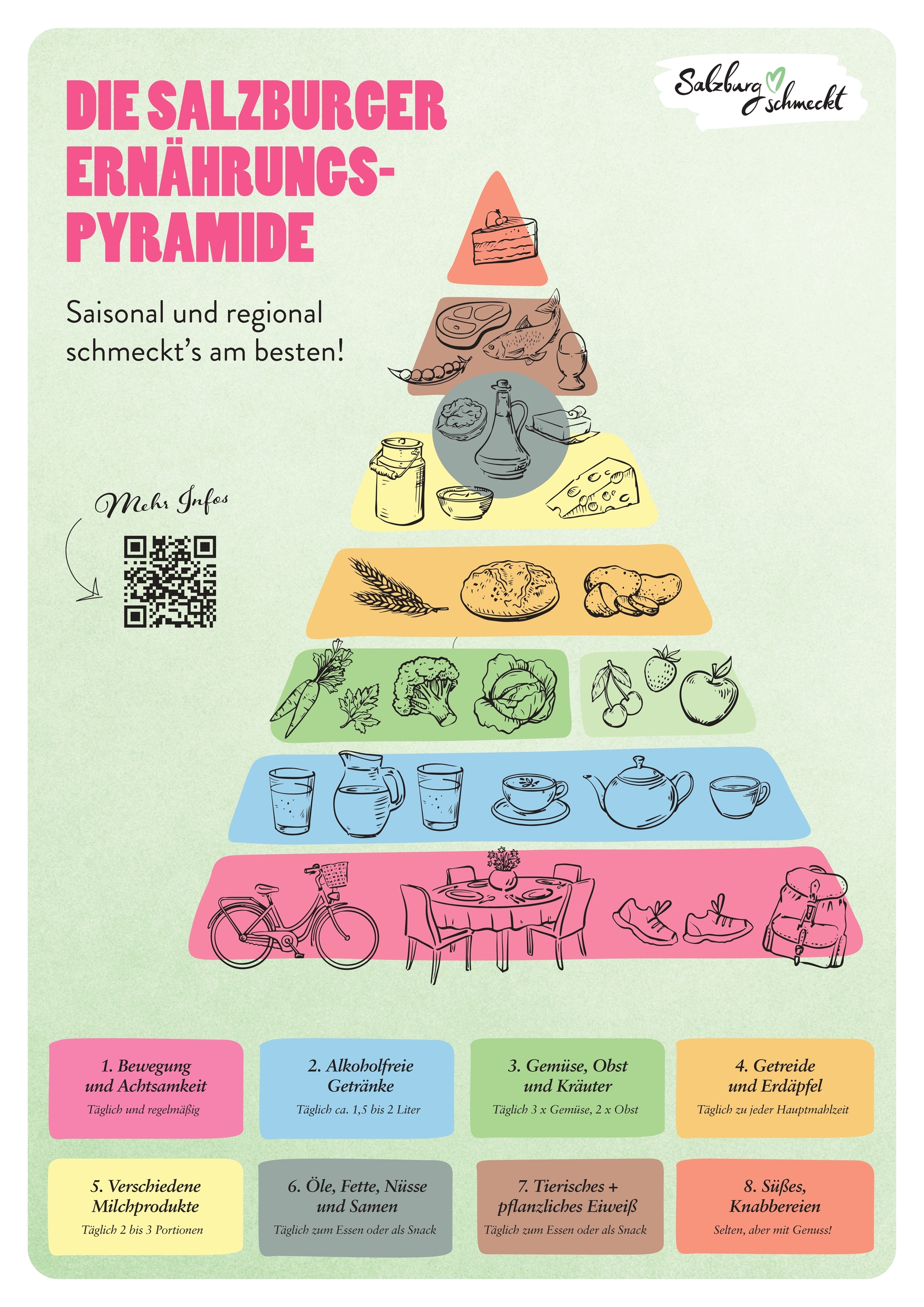 "Hochwertige Lebensmittel - schmackhaftes Essen - gesunder Körper" - nach diesem Motto hat sich auch das Salzburger Agrar Marketing überlegt, eine regionale Version der Ernährungspyramide zusammenzustellen. Inkludiert wurden auch die Wichtigkeit von Bewegung und der achtsame Umgang mit seiner Gesundheit. Dies ist die Grundlage für einen gesunden Körper. Man soll regelmäßig sportliche Aktivitäten und Bewegung im Alltag integrieren und den Genuss unserer so guten Lebensmittel bewusst wahrnehmen - hier sollten wir auch den Grundstein der Ernährung unserer Kinder ansetzen. Was esse ich - woher kommt das Essen bzw. die Produkte - wie wichtig ist eine gute Ernährung - und wie schön ist dann das Ganze noch kombiniert mit dem täglichen gemeinsamen Essen mit der ganzen Familie?