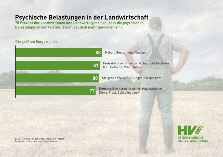 "Drei Viertel der befragten Landwirte gaben an, dass vor allem psychische Herausforderungen in den letzten Jahren mehr geworden sind. Auch bei den körperlichen Belastungen gibt es eine Zunahme, diese liegt allerdings klar unter dem Ausmaß der psychischen. Auffällig ist, dass vor allem Landwirtinnen und Landwirte über 50 Jahre und jene, die angegeben haben, dass sich ihr Gesundheitszustand in den letzten Jahren verschlechtert hat, verstärkt von psychischen Belastungen betroffen sind“, so Pargfrieder zur aktuellen MARKET-Umfrage, die Ende Juli durchgeführt wurde und führt weiter aus: "Die größten Sorgen und Bedenken haben die Befragten insbesondere durch preis- und kostengebundene Faktoren. Acht von zehn gaben an, von Sorgen aufgrund steigender Preise für Dünger und Energie sowie höheren Steuern und Abgaben betroffen zu sein. Für ebenso viele stellen Preisstürze für landwirtschaftliche Produkte und Ernteausfälle durch Unwetter, Hagel, Dürre, Frost, Schädlinge usw. große Bedenken dar. 82%, das bedeutet vier von fünf der Befragten, sind aufgrund dessen zumindest teilweise von psychischen Belastungen betroffen. So gaben davon 45% an, an Stress durch Ernteausfälle zu leiden. Zukunftsängste (34%), anhaltende Müdigkeit (32%) und Schlafstörungen (24%) zählen ebenfalls dazu. Nur 17% der Befragten gaben an, keine psychischen Beschwerden zu haben.“