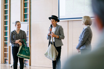 Nach den inhaltsreichen und wertvollen Impulsen des Vormittags wurde nach dem Mittagessen das Magazin „LandWIRtin“ vorgestellt. Judith Muxel-Winder und Maria Dünser haben in Zusammenarbeit mit der Landesbäuerin, den Gebietsbäuerinnen und der Agentur Winder & Wild ein wunderbar ansprechendes Magazin über die Vorarlberger Landwirtinnen geschaffen, das großen Anklang bei der Ortsbäuerinnentagung gefunden hat. Ein Highlight war die Fahrradtour von Carolina Trauner, alias Emilie, durch den Veranstaltungsraum im BSBZ, auf welcher sie alle neun vorgestellten Gebietsbäuerinnen im Magazin zu ihren Betrieben und ihrer Motivation für die Mitarbeit in der Bäuerinnenorganisation interviewte. Das Ergebnis ist ein vielfältiges und positives Bild der Vorarlberger Bäuerinnen, kombiniert mit weiteren Themen aus der Bäuerinnenorganisation. Vorab schon ein herzliches Dankeschön an alle Ortsbäuerinnen, die das Magazin an die bäuerlichen Betriebe und weitere Interessierte verteilen! In ihren Zukunftsvisionen zieht Landesbäuerin Andrea Schwarzmann Resümee über das gemeinsam Erreichte und lädt ein, die bäuerliche Zukunft weiterhin mitzugestalten: „Unsere Kraftquellen und Vertrauen in uns selbst, Vertrauen in die bäuerliche Gemeinschaft und Vertrauen in die Gemeinschaft trägt uns und hilft uns gemeinsam voranzukommen. Mein Leitmotiv und Arbeitsmotto seit meiner Zeit als Bundesbäuerin ist: ‚Wir bauen auf Vertrauen!‘ Der Bäuerinnenberuf ist vielfältig, individuell, wertvoll und attraktiv. Bäuerinnen sind glaubwürdige Botschafterinnen für die regionale Landwirtschaft. Die Bevölkerung hat Vertrauen in die heimische Landwirtschaft und schätzt die Arbeit der Bäuerinnen. Vielen Dank für euer Dabeisein heute und für das Mitgestalten und Arbeiten auf Gebiets- und Ortsebene mit den verschiedensten ‚Hüten‘!“